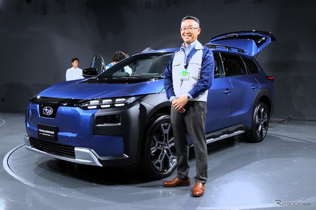 先にアメリカで発表され。29日に日本でも発表された『ソルテラ』の商品改良車をベースに、内外装や荷室、動力性能を大きく変化させた。外装について、「ソルテラは都会向けに洗練された方向に進化させたのに対して、トレイルシーカーはラギット方向に大きく変化。大型の樹脂クラッティング、ルーフレールを装備するとともに、前後のデザインもよりラギットな方向に仕上げた」とSUBARU商品事業本部プロジェクトゼネラルマネージャーの井上正彦さんは語る。