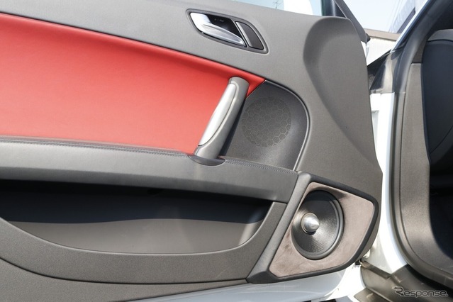 前編でお伝えした通りラゲッジのフロアにフラットで美しいオーディオインストールを施した藤井さんのアウディTT。サウンドのキーポイントになったのはフロントに選んだフラックスのユニット群だ。美しい立体造形のアウディのドアを尊重するアウターバッフルは純正位置に自然に収まりフィット感が高い。外周部はレザーでドアと一体化しバッフル面はグレーの人工スエードでまとめたシックな佇まいで一体感も申し分ない。
