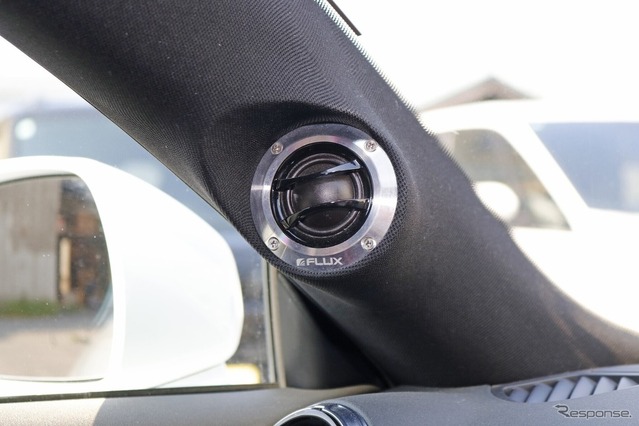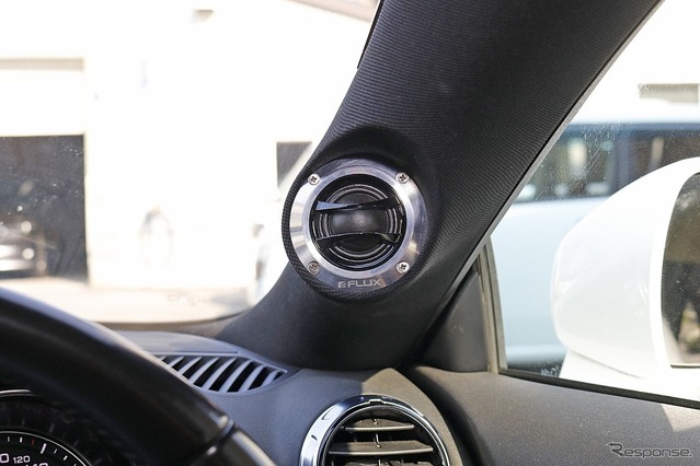 フラックスの2ウェイで組んだフロント。インストール面でのこだわりはAピラーのデザインにある。やや大きめのグリルを持つツイーターをスマートに内包する造形はサウンドの方向性に合うナチュラルテイスト。ツイーター部のえぐり処理や角度付けで存在感も適度に主張しオーナーの満足度を高めた。さらにツイーター直下のエアコン吹き出し口は丸型でメッキグリルを備えデザインがツイーターとマッチ。視覚的な統一感が心地よい。