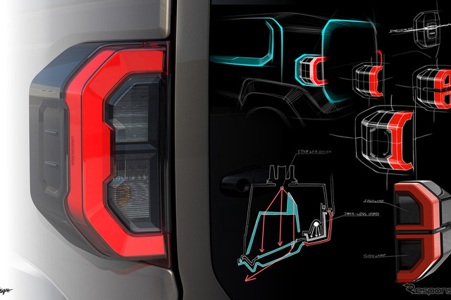フロントだけでなくリアについても「どこから見ても新しいランドクルーザーという佇まいを目指した」。その原点となったのは『FJ40』だ。「ランドクルーザーの起点であり、ランドクルーザーの知名度をここまで上げてきてくれたクルマ」としたうえで、「ランドクルーザーでありながらプレイフルな感じもありますので、そこに、新しい時代に合った価値観を取り入れました」。「時代が変われば提供するものも進化していかなければいけません。『ランドクルーザー70』のようにずっと変わらない形もありますが、FJのように新しいお客様に向けて出すものは、新しい価値観を入れなければいけない。そこで特にリアはとてもアイコニックにしています」と話す。