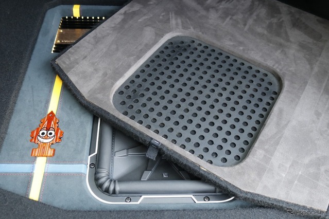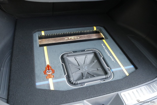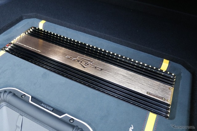 ラゲッジの中央部にサブウーファーとパワーアンプをシンプルに収めたスタイルだが、印象的なデザイン処理が加えられているのが特徴。キーになるのは縦横に走るラインとステッチ使いだ。イエローのラインとブルーのラインを交差させ、その両脇にはレッドのステッチを施す、青、赤、黄色の3色構成とした。これはキッカーが各グレードに用いている3つのカラーをイメージしたものだ。