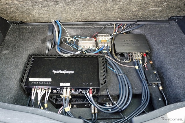 ラゲッジにインストールされるユニットはパワーアンプ×3台、DSP、ブルートゥースユニットなど。ラゲッジのフロアボードを開けると、上段のパネルにはサブウーファーをドライブするロックフォードのパワーアンプT1500-1bdがインストールされている。