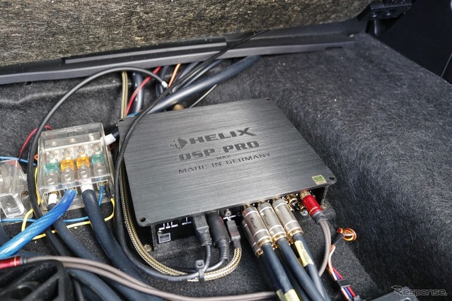 さらに中段を仕切っているフロアボードを跳ね上げると、多数のユニットが収まる下段が現れる。ここにはツイーター/ミッドレンジをドライブするロックフォードのパワーアンプT600-4が中央にインストールされ、右前方にはヘリックスのDSP PRO MK2を設置している。DSPからパワーアンプへのRCAケーブルの取り回しや、ターミナルブロックからのパワーケーブルの取り回しもスムーズで、無理のかからないレイアウトとしている点も美しい仕上がりだ。