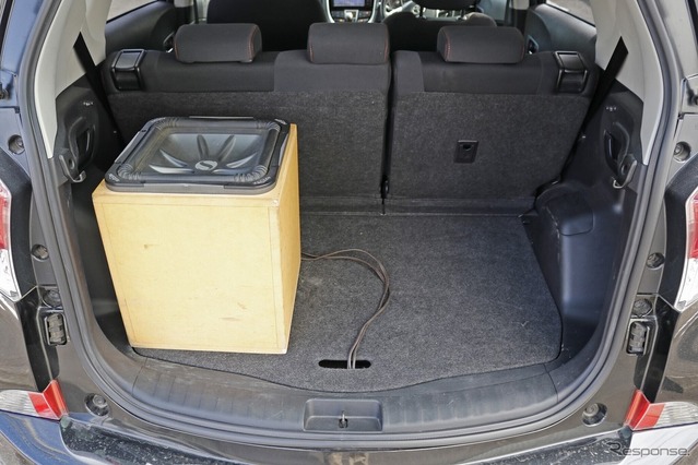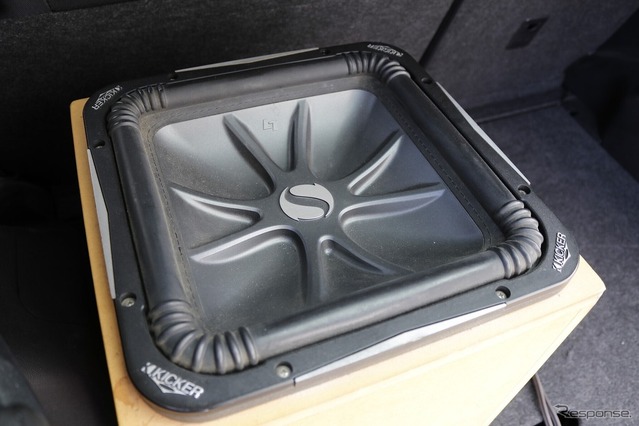 ラクティスのラゲッジは先にも紹介した通り、積層構造で多数のユニットをスペース効率よく収めているのが大きな特徴だ。ラゲッジ上に見えるのはサブウーファーのみというシンプルさで、サブウーファーユニットにはキッカーのL7を採用している。縦長のエンクロージャーをラゲッジ左側に設置し、右側にはしっかり積載スペースを確保している。