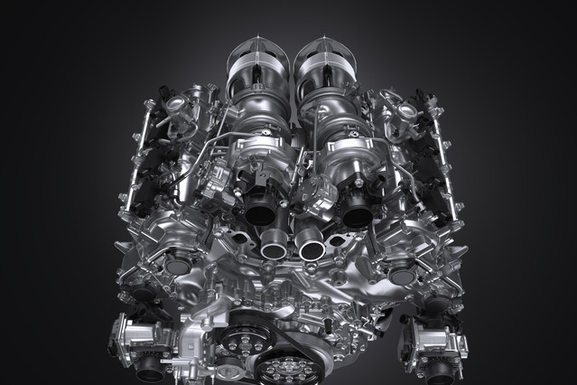 トヨタ自動車として初めて市販車に搭載する4L V8ツインターボエンジンは、GR GTの「低全高、低重心パッケージ」を実現すべく、「徹底的に小さく、軽く」を設計思想として開発した。ボア×ストローク:87.5×83.1mmのショートストロークによるエンジン全高の低減に加え、バンク内に2つのターボを配置したホットV形式、ドライサンプシステムを使うとともに、オイルパンの薄型化も図った。