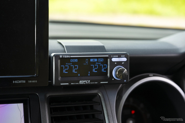 いよいよサスペンションができあがった。想定通り約30mm車高はアップ。減衰力調整はEDFC5で室内から調整可能。EDFC5の特徴である速度やG、ジャークに応じた自動制御も可能。