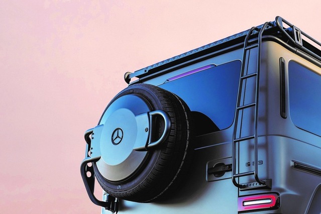 リアゲートに備わるスペアタイヤには、通常モデルではタイヤ全体を覆うカバーが設置されているのに対し、本モデルではタイヤの中央部分のみをホールドするタイヤホルダーが装備されており、究極のオフローダーとしてのGクラスのキャラクターをさらに強調している。