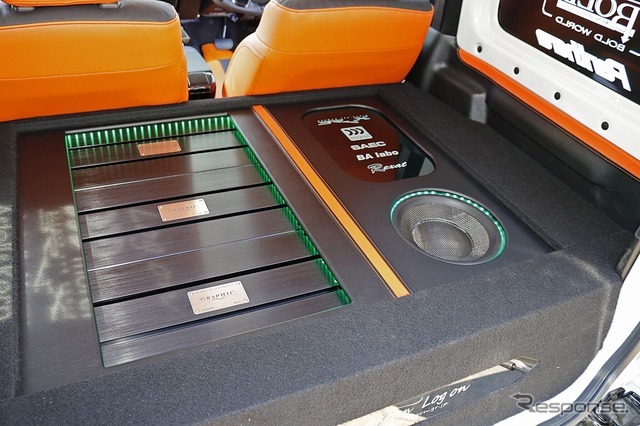 パワーアンプの周囲やサブウーファーの外周にはマルチカラーのLEDを仕込んでイルミによるショーアップ効果も引き出す。ラゲッジを開けた際の華やかさを加えているのもヘビーカスタムを目指すヒロさんの内装カスタムへのこだわりから。