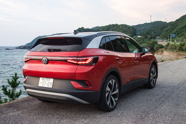 ID.4は本拠地ヨーロッパ市場では2021年にデビューしたコンパクトクラス(日本ではミッドサイズ)のクロスオーバーモデル。同社のエンジン車では『ティグアン』に相当する車格である。車体サイズは全長4585×全幅1850×全高1640mmと、一般的なコンパクトクラスSUVに比べてルーフが若干低め。そのぶん空力特性はCd値0.28と、ティグアンの同0.31より優れた数値となっている。