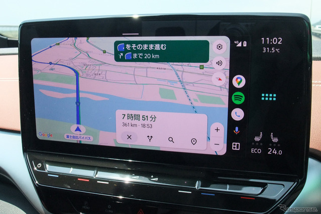 筆者のスマホのOSはGoogleのAndroidなので、AndroidAutoを通じてGoogleMapをディスプレイに表示させる。最近のVW車はインパネ内にナビ画面を表示させることができ、その地図の拡大・縮小も直感的に行えるなど優れたユーザビリティを実現させていたが、ID.4は「この先何メートル先を右に」といったディレクションのみが表示される、欧州で主流の方式だった。