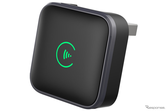 当品をカープレイ対応機にUSB接続することで、スマホのワイヤレス・カープレイ接続が可能となる。当品とスマホとがBluetoothにて繫がり、「カープレイ」に対応するスマホアプリの表示を車載機のモニターに映し出せるようになり、操作も車載機のモニター上にて行える。