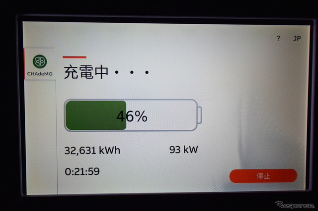 ロードテスト中、バッテリー残量が20%以下という充電に適した状態で30分チャージした場合(料金は150kW機が2250円/30分、90kW機が1350円/30分)の投入電力量の実績値を紹介しておく。
