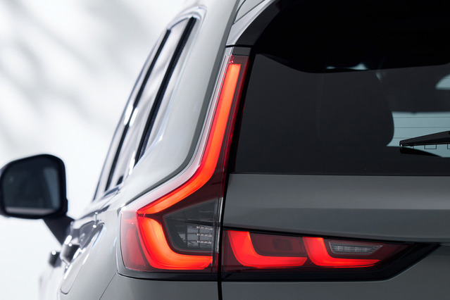 外装デザインは、水平基調のシンプルな造形としながら、力強さと洗練、上質さや大人らしさを凝縮。代々受け継がれてきたCR-Vの象徴とも言える縦型のリアコンビネーションランプを踏襲しながら、L字型とすることで先進感も感じさせながらどっしりとした安定感も表現した。フロントマスクは水素燃料電池車の「e:FCEV」とは大きく差別化し、大開口のブラックグリルと薄型のマルチファンクションライト(ヘッドライト)が、SUVらしいスポーティな表情を生み出している。
