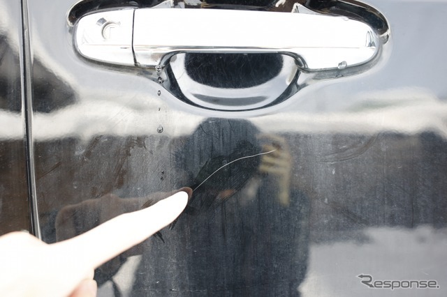 最初に行うのはキズの状況把握だ。ポイントはキズの深さで、どの層まで及んでいるかで作業難度が変わる。ボディは一般的に表面のクリア層、その下に塗装面、さらに鉄板という構造だ。キズ部分をきれいに洗うと状態が見えやすくなる。