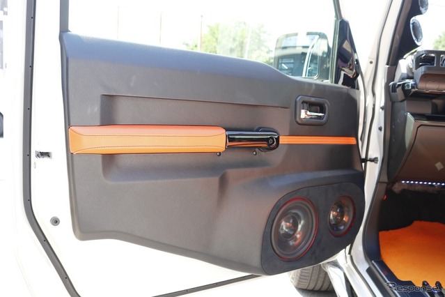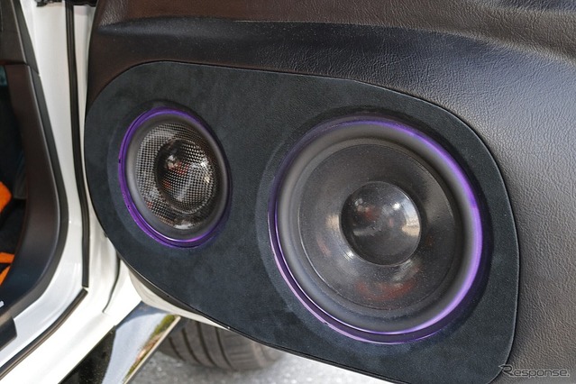 ドアのデザイン面でも手の込んだカスタム処理が施される。大胆加工が施されたドアに、片側2発のミッドバスを違和感なくインストールしたスタイルはカスタム色も濃い。各ユニット周辺にはマルチカラーのイルミネーション処理が施され、ラゲッジまわりのカスタムインストールとの整合性もしっかり取っている。ドア下部の前半分はワンオフ加工されているものの、純正ラインとも美しくつなげて内装デザインにフィットさせた。2つのスピーカーユニットを内包する楕円形のバッフルもコクピットの象徴的なデザインとなっている。