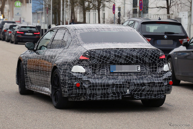 プロトタイプをさらに見ていくと、フロントとリアのホイールアーチはどちらもワイドに構え、Mブランドモデルにふさわしい、非常にアグレッシブなルックスを演出している。また、リアエンドでは、コンパクトで鋭い新LEDテールライトの一部が初めて露出した。現行M3にサウンドでは負けるかもしれないが、視覚的な存在感は同等だ。