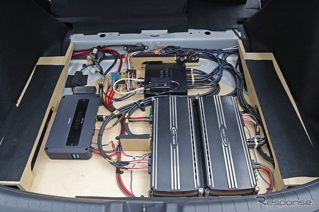 ラゲッジの床下スペースにはフラットなアンプラックを組み、ARCオーディオの2台のパワーアンプを中心に、サブウーファー用パワーアンプのオーディソンSR1.500、さらにヘリックスのDSPであるDSP ULTRAなどをインストールしている。
