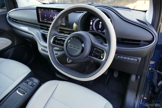 試乗車はICE時代に“チ(C)”と呼んだ電動開閉式ソフトトップ仕様の“オープン”。FIATのモノグラムを一面の柄にしたトップとオーシャングリーンのボディ色の、限定車か!?と思わせられるコーディネーションは、標準車ながら特別感を漂わす。以前、別の取材で乗ったことがある個体だったが、相変わらずのハイセンスぶりは変わらない。インテリアも同様で、限りなく白に近いFIATのモノグラムパターンのエコレザーシートは縫製もしっかりしており質感も満足できる。