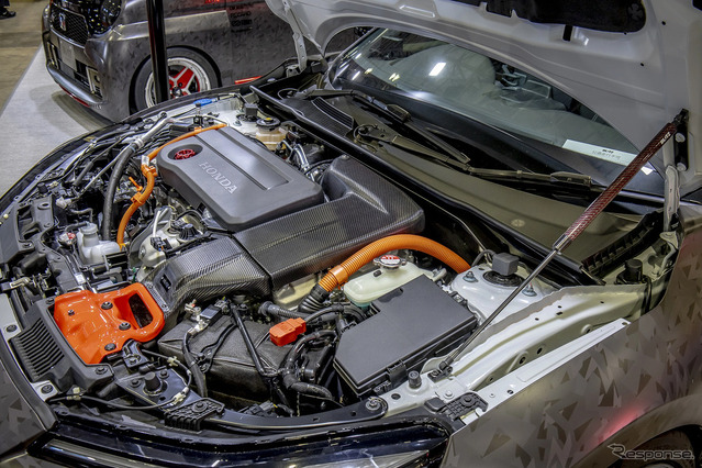 いち早く開発中のプレリュードのデモカー。エアロパーツはフロント/サイド/リアにアドオンタイプを製作。クラッシュドカーボンはステッカーによるもので、製品化時は検討中とのことだが控えめなサイズで邪魔にならず、それでいてデザイン性が高い。車高を低く見せつつスタイリッシュに仕上げている。ウイングも開発中で、さりげない純正風デザインが全体にまとまりをもたらしてくれる。