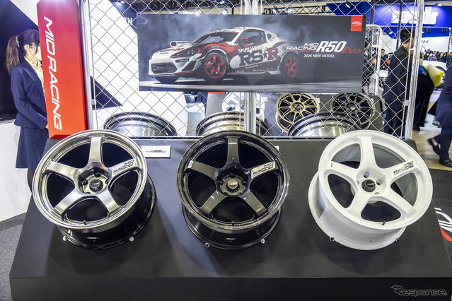 これまでのMIDは手に取りやすい価格帯のホイールが軸になっていた。EVOではわずかに価格帯が上がるが、その代わりとして日本製とすることで、さらなるスポーツ性能を狙った。レイズ傘下のMIDでありながら、レイズの鋳造ホイールであるグラムライツとは一線を画す新たなコンセプトを狙ってMIDが企画。設計・製造はエンケイというコラボレーションで生まれたのだ。R50EVOはその名の通り、5本スポークで広い開口部を特徴としたスポーツモデル。17インチ7.0Jから18インチ10.5Jまでをラインアップする。