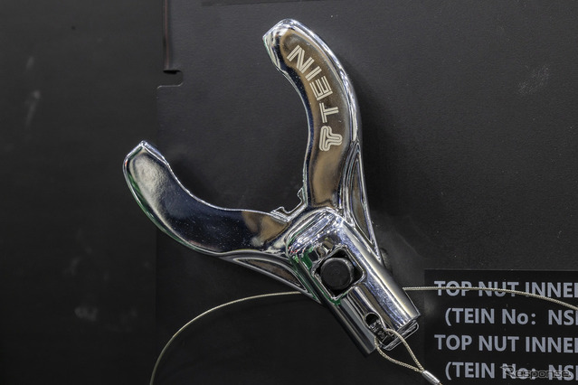 そこでインパクトレンチの使用は勧められないが、工具も入らない状況に備えて開発されたのがこの特殊工具である。このTOP NUT INNER取り付け治具は、フレアナットレンチのように逃げのあるソケット形状とすることで、その中に工具を入れられる。回しにくいトップナットも固定しながら回して緩めることができ、こちらは春頃発売予定だ。こうしたサスペンションにまつわるこだわりのパーツまで自社で製作し販売しているのがテインである。