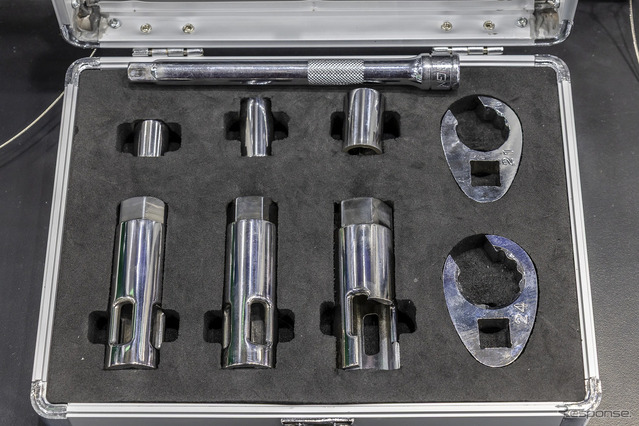 次に注目はサスペンション専用特殊工具。テインの車高調レンチは扱いやすくタフだというのは知られたことかもしれないが、両サイドからケースを挟むことでより確実に回しやすいブラケットロッククワガタレンチが登場。正確には昨年限定販売されたが、あまりの売れ行きに通常カタログモデルとしてラインアップされることになった。