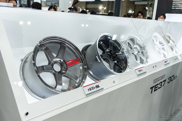 ブース内の30周年アニバーサリーコーナーでひときわ注目を集めたのは30周年のために新たに用意された限定ホイールであるTE37 30thアニバーサリーモデル。「TE37 SAGA S-plus 30thアニバーサリー」「TE37 SAGA SONIC 30thアニバーサリー」「TE37 SAGA ULTRA LARGE P.C.D. 30thアニバーサリー」が展示されて多くの来場者を集めた。傍らには往年のTE37も並べられ歴代モデルへのオマージュを感じさせる作りになっているのも特徴だ。