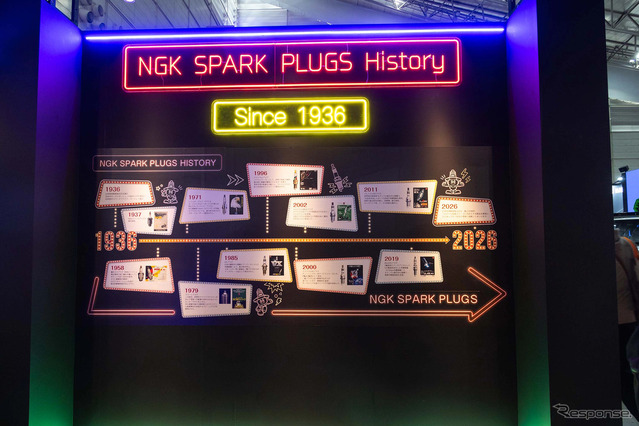 展示ではNGKスパークプラグの歴史も紹介された。それによれば日本特殊陶業が創立されたのは1936年で、1937年にはスパークプラグの生産を開始している。純国産車のトヨタクラウンがデビューしたのは1955年のため、それより20年近くも前に創立したことになる。日本のモータリゼーションを支えてきた歩みがうかがえる。