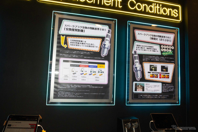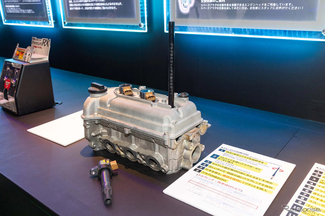 パネル展示ではスパークプラグの働きや構造、交換の必要性と時期などが紹介されていた。エンジンのカットモデルも展示され、吸気、圧縮、膨張、排気の4行程を作動状態で確認できるようにしていたほか、ノーマルプラグと「プレミアムRXプラグ」の点火状態の違いを確認できるデモ機も用意された。