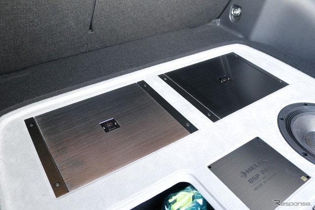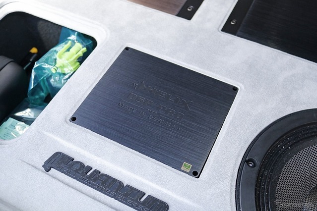 ラゲッジにはここまで紹介してきた通り、多数のユニットがフラットに組まれている。しかしその一部に収納が設けられているのが見える。これはオーナーがリクエストしたパンク修理キットを収めるスペースだ。オーディオとクルマの使い勝手を両立させたいと思ったオーナーがショップにオーダーし、ラゲッジインストールの際にあえて小型の収納を設置することにしたのだった。