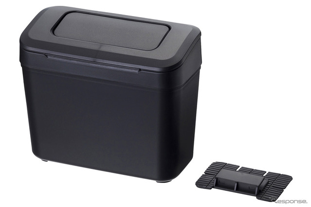 でこれらは、しっかりしたボックス型であることが特長。そしてフタが付いているので中のゴミが見えないことも利点だ。なおフタを上げて開口部を広く取ることも可能で、フタをしている場合にはフラップ部分を押し下げればゴミを入れられる。またフタとボディには段差がなく見た目がスッキリと仕上げられていることもストロングポイント。センターコンソールのサイドに貼り付けて使用するのだが、貼り付けベース部分は大きく、そして曲がるので固定がしやすい。