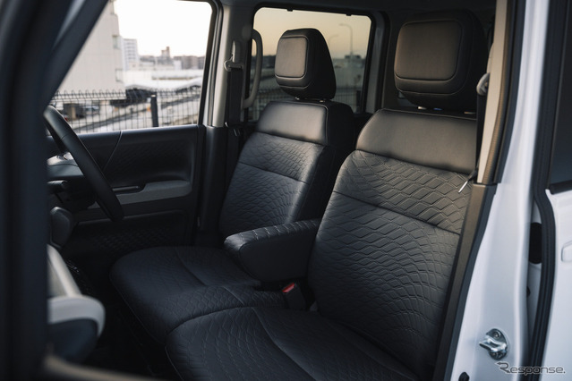 ハイウェイスターを含め、ルークスの内装はライトカラー基調だが、AUTECH LINEは一転してブラック基調のダークトーンに変貌。そしてシートには、レザーのように上質な手触りを楽しめる防水生地のフレーザークロスを使用。