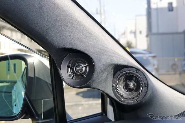 スピーカーはRSシリーズの2ウェイモデルTS-Z1000RSに、ミッドレンジのTS-S1000RSを加えたフロント3ウェイを構築。取り付けの見どころはAピラーだ。ツイーター/ミッドレンジを加工取り付けするが、ミッドレンジはやや車体中央寄り、ツイーターは外側にオフセットしたインストールとしている点も特徴的。各スピーカーの角度づけも含め、各帯域の特性を考慮したスピーカーインストールとなった。