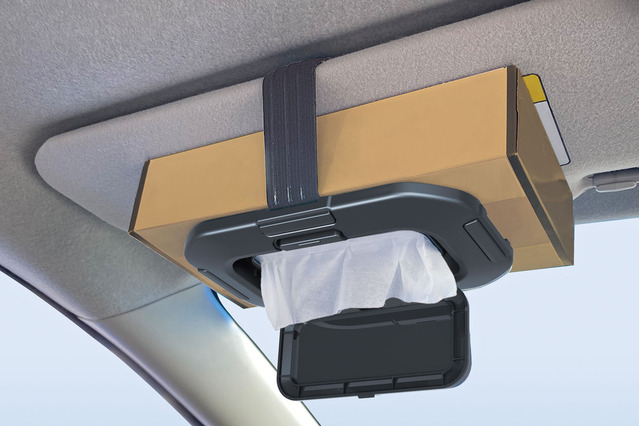 なお、フタ(開けやすいワンタッチオープン機構付き)が装備されているのでティッシュを隠せる。サンバイザーに付けたときには、ティッシュが垂れ下がるのを防げる。滑り止め付きのゴムバンドと面ファスナーでしっかり固定できることもメリットだ。ボックス交換もやりやすい。