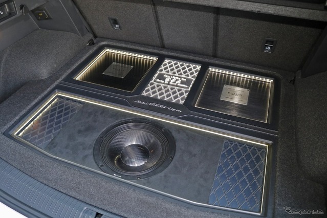 ラゲッジはプロテクションを施せば完全なフラットフロアを作れるのもポイントだ。フロア後方にはサブウーファーの音抜け孔を設けているが、表面のカーペットには影響を及ぼさず、ぱっと見は完全な純正フロアに見える仕上がりにした。