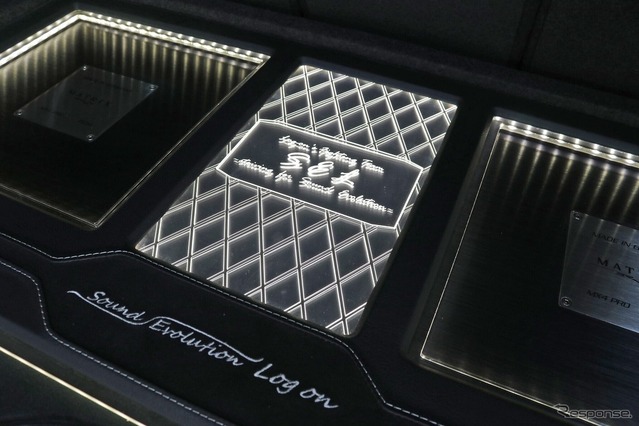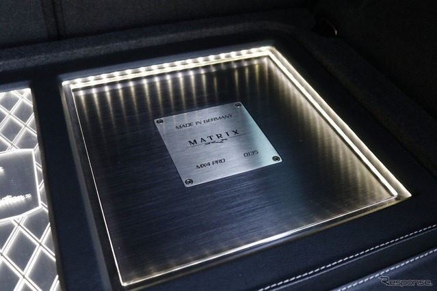 しかしひとたびカバーを外すと、2台の大型パワーアンプとサブウーファー、さらにアクリルとイルミでショーアップされたフラットなラゲッジスペースが現れる。見た目のインパクトは十二分で、そのギャップを楽しむのもこのクルマの醍醐味だ。左右対称のレイアウトでかっちりとまとめられたデザインは、ブラックのマトリックスMX4 PROの角デザインを踏襲したもの。ラゲッジ全体に及ぶスクエアなデザイン処理が美しく決まっている。