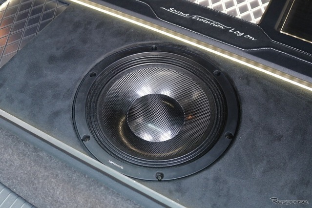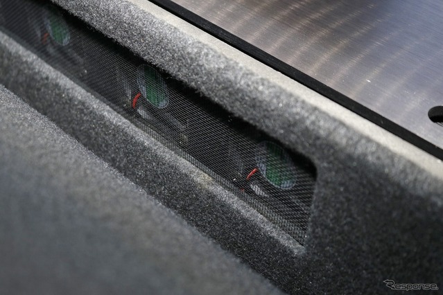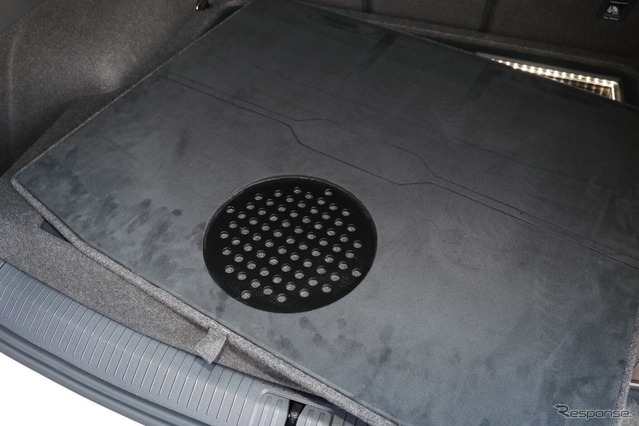 ラゲッジ後方にはサブウーファー(カロッツェリアTS-W1000RS)を1発インストールする。ラゲッジ幅いっぱいに作られたフラットスペースの中ほどに人工スエードを使ったバッフルを設置して取り付けた。プロテクション用のフロアボードには音抜けの孔を設け、ボードをかぶせて使う普段使いの状態でも確かな低音を車内に響かせることにこだわっている。