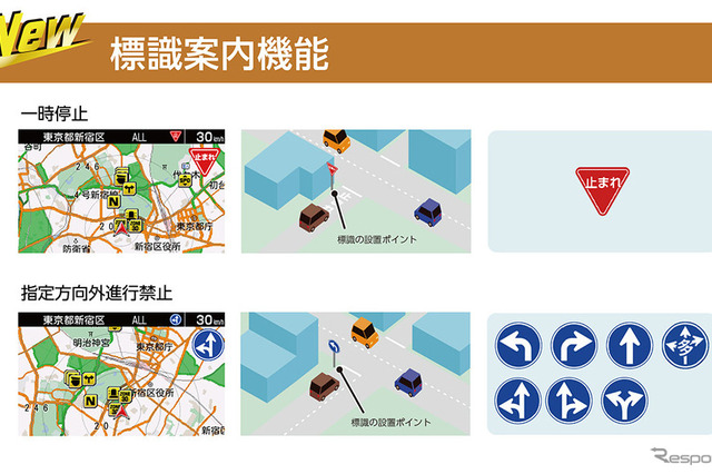 標識案内機能を搭載し、走行中の市街地道路にある「一時停止」や「指定方向外進行禁止」を通知。業界初となる災害・危機管理通報サービス「災危通報」に対応し、政府機関が発令する地震や津波などの災害情報を表示と音声で通知する。