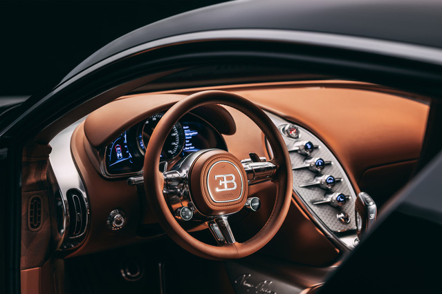 F.K.P.オマージュのインテリアは、シロンや『ミストラル』を含む他の最近のW16モデルと比較して、ほぼ完全な革命を表している。オリジナルのヴェイロンのような円形でバウハウス的な特徴を持つユニークなステアリングホイールに、ソリッドアルミニウムブロックから削り出された完全にビスポークのセンターコンソールとトンネルカバーが加わる。パリで独占的に織られたカスタムカークチュールファブリックは、『トゥールビヨン』で導入されたブガッティの最新のインテリアパーソナライゼーションの進歩を表している。これはヴェイロンのレザーオンリーインテリアからの進化だ。