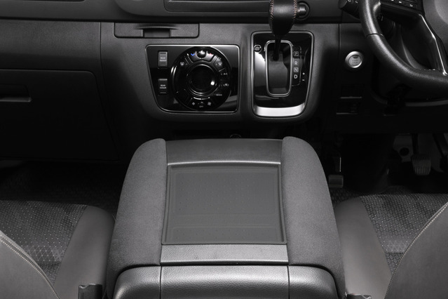 センターコンソールトレーは、センターコンソールのアームレスト間の凹みに合わせた設計。内寸約200×160mmの小物置きスペースで、スマートフォンや財布、チケット、電子タバコなどの一時置きに適している。シリコン素材で小物が滑りにくい仕様だ。キャラバンのマルチコンソール仕様車専用品。