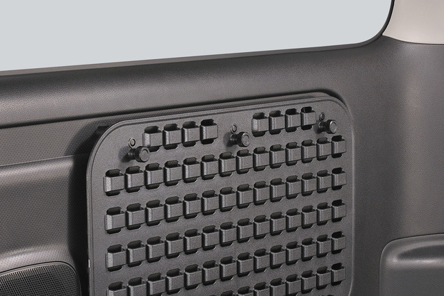 モールパネルは、左側後輪タイヤハウス上のデッドスペースを収納に変える製品。タイヤハウス上のユーティリティナットを使用するため車体加工は不要で、プラスドライバーのみで約5分で取り付けられる。MOLLE(モール)システムに対応し、凹凸のある構造でベルトを通しやすく、モール対応アイテムを自在に取り付けられる。4種類の専用アタッチメントが各3個ずつ付属し、工具や小物、バッグ等を掛けることができる。強度の高いABS樹脂を採用し、軽量かつ高い耐久性を実現した。一度装着した後は、工具なしでパネルの着脱が可能だ。「バンタイプ車両」かつ、グレード名に「プレミアムGX」もしくは「AUTECH」が含まれるグレード専用品。