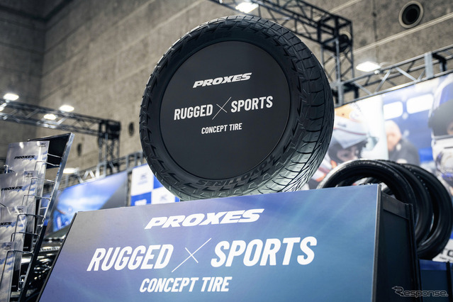 ブース向かって左側にはプロクセスブランドの世界観を表現する4台のデモカー、さらに右サイドにはオフ&アウトドアイメージを強く感じさせるオープンカントリーのデモカー3台を展示したトーヨータイヤ。その中央に展示されていたコンセプトタイヤの「PROXES RUGGED×SPORTS」にも大きな注目が集まった。