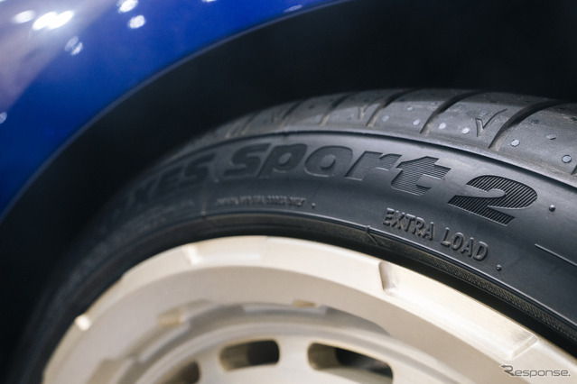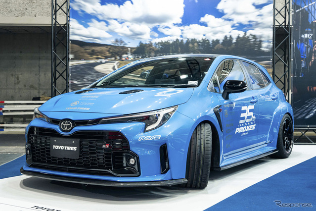トーヨータイヤのイメージカラーを思わせる鮮やかなブルーをまとったトヨタ『GRカローラ』は、M2と同じく「PROXES Sport2」(265/35R18)履き、ホイールにはレイズのTE37 SAGA S-Plus(18×9.5J)を組み合わせた。