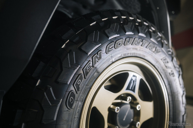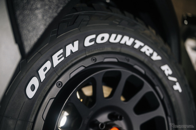 豊田自動織機の各種パーツ群を満載した車両はアウトドアをアクティブに楽しむのにぴったりの仕様にセットアップされている。そんな車両を彩っているのが「OPEN COUNTRY R/T」(265/65R17)、人気のホワイトレターで足元をドレスアップ。同時にオフロードイメージを盛り上げつつ、おしゃれ感を高めることにもつなげている。SUVベースのアドベンチャー仕様=オープンカントリーといった定番セレクトを強く感じさせる足回りコーデとなった。