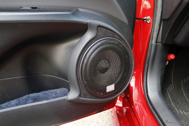 ミッドバス(MB6D)はドアにアウターバッフルを組んでインストールする。純正のポケット構造を生かしたフォルムを作り込み、ドア内張りのデザインにうまく融合させているのも見どころだ。バッフル部分のみの加工でありながら唐突さはなく、インテリアに自然にフィットしている。パンチングメッシュによるプロテクションも施し、実用性まで含めて仕上げた点もこだわりだ。