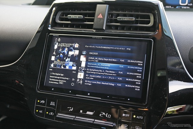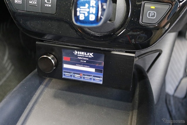 オーディオプレイヤーに用いるのは、オーディオテクニカの車載メディアプレイヤーAT-HRP5。ナビ画面にメニューや収録曲リストを表示でき、車内での操作性を高めて使い勝手の良いシステムになった。音声信号はDSP(ヘリックスDSP PRO MK3)へ入力され、ARCオーディオのパワーアンプを経て各スピーカーを駆動する構成としている。