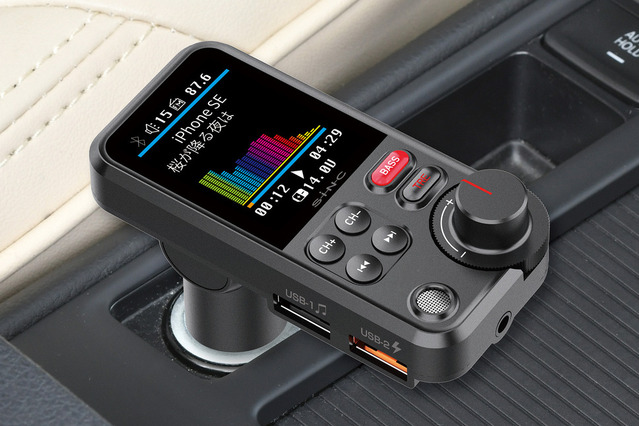 最後にもう1つ、「SEIWA(セイワ)」の定番品、『Bluetooth FMトランスミッター( BTF110)』(価格:オープン、実勢価格:5480円前後)をお見せする。当品もDCソケットに挿して使うタイプだが、こちらは曲名や音量等の情報を表示できるカラーディスプレイを装備する。なのでその分筐体は大きくなるが、逆にメカっぽい存在感を発揮するので、インテリアにてオブジェ的な魅力も放つ。