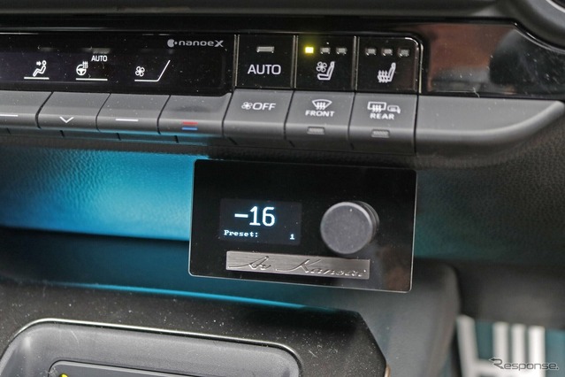 オーディオプレーヤーには、上質なサウンド再生が可能なFiioのM15Sをチョイス。コクピットの見やすい位置にホルダー固定することで、優れた操作性を確保している。また、リゾルトの操作部兼表示部はダッシュ下部に取り付けられている。こちらも手を伸ばしやすい使い勝手のいい位置を選んだ。さらにショップのエンブレムを加えて上質感を高めているのも見どころだ。ブルーのイルミネーションは車内各部に施された間接照明ともマッチし、インテリア全体の統一感を引き出している。内装ドレスアップに対するオーナーのこだわりがうかがえるポイントでもある。