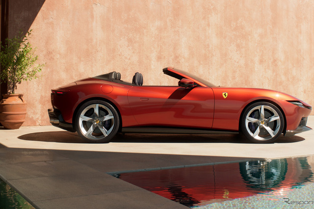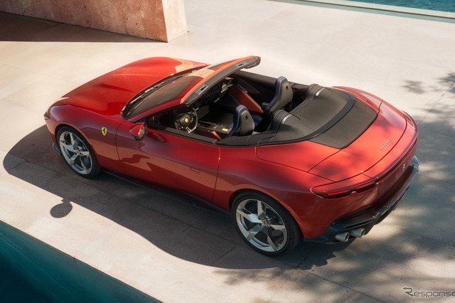 新型車は、フェラーリのパフォーマンス志向のライフスタイルを体現するオープンエアモデルとして開発。テーラーメイドまたはテクニカルファブリックのソフトトップは13.5秒で開閉でき、最高速度60km/hまでの走行中でも操作可能だ。コンパクトな車体寸法と大容量のラゲッジスペースにより、クラストップレベルの実用性を実現している。