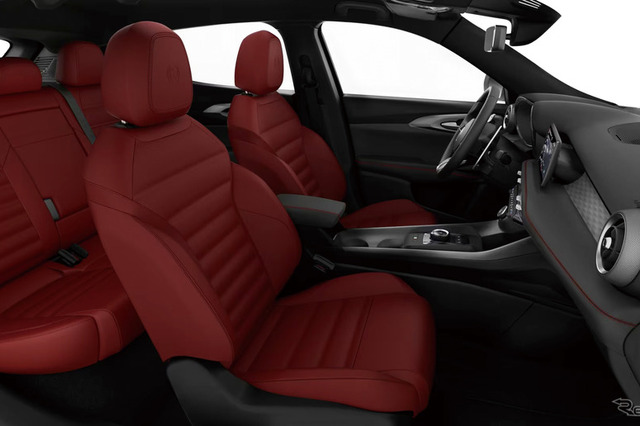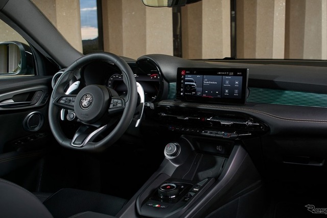 フロントおよびリアのエンブレムは、「33ストラダーレ」や、昨年発売したコンパクトモデル『ジュニア』と同様のモノクローム仕様を採用。新世代アルファロメオのアイデンティティを象徴するディテールとして、端正な佇まいを際立たせている。リアの「トナーレ」レタリングバッジは、従来のシルバーからダークカラーに変更し、Veloceグレードのサイドに施されるVeloceバッチと統一感を持たせた。